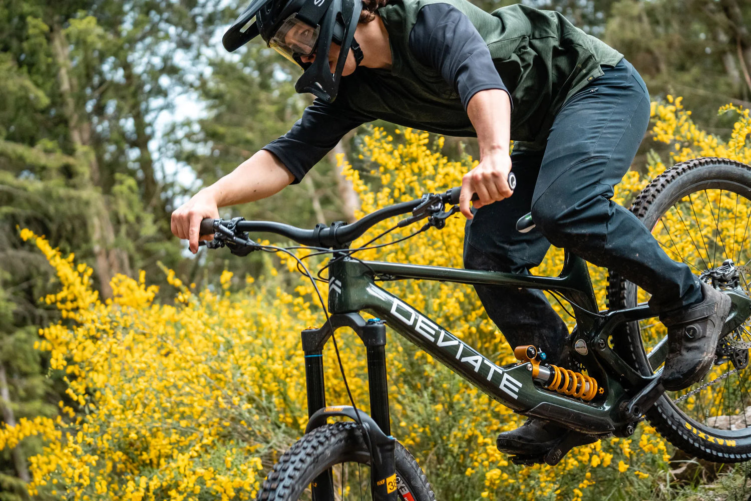 Das High-Pivot-Fahrwerk von Deviate sorgt für eine sanftere und sicherere Fahrt, indem es Pedalrückschlag minimiert und das Tempo auf anspruchsvollem Terrain aufrechterhält. Der rückwärts gerichtete Achsweg absorbiert effektiv kantige Schläge, wodurch Geschwindigkeit und Kontrolle erhalten bleiben. Gleichzeitig sorgt die stabile Geometrie beim Bremsen dafür, dass der Fahrer stets in der optimalen Position bleibt, um selbst die härtesten Hindernisse zu meistern.
